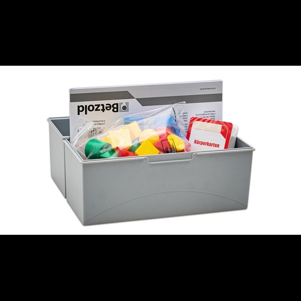 - 40 Körper aus Kunststoff: 10 verschiedene Körper (Würfel, Quader, Kegel, Kugel, Halbkugel, dreiseitiges und sechsseitiges Prisma, dreiseitige und vierseitige Pyramide, Zylinder) in je 4 Farben